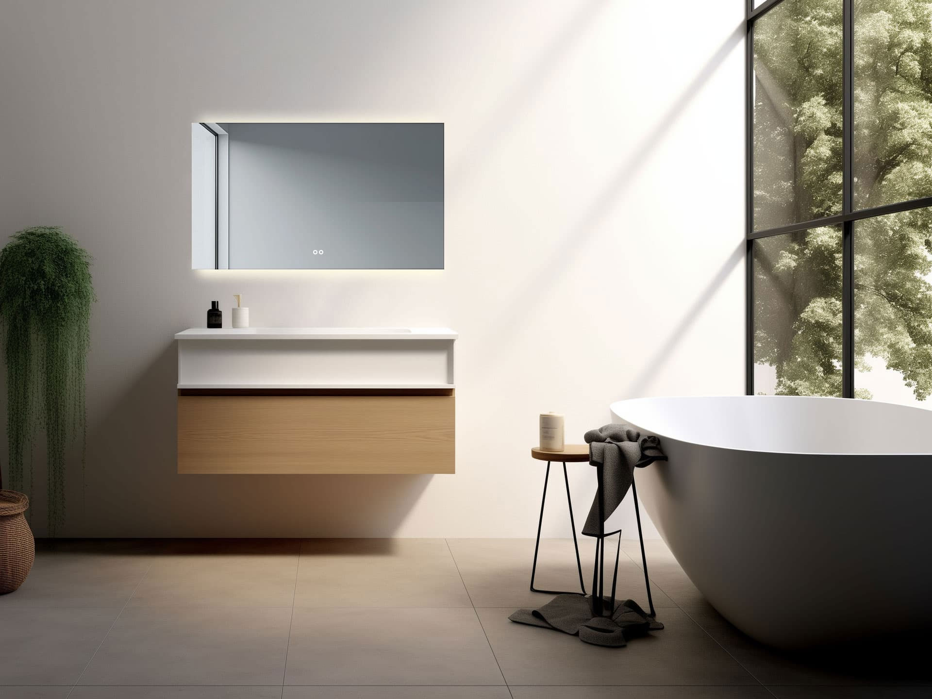 Sowohl die Beleuchtung als auch die Heizung werden mit dem linken Touch-Schalter an der Vorderseite des Spiegels gesteuert. Durch langes Drücken des Touch-Buttons wird die Beleuchtung stufenlos gedimmt. So können Sie die richtige Lichtintensität selbst einstellen. Mit der rechten Touch-Taste können Sie die Farbe der Beleuchtung selbst bestimmen. Sie können stufenlos zwischen Warmweiß (2700K) und Kaltweiß (6400K) wählen.