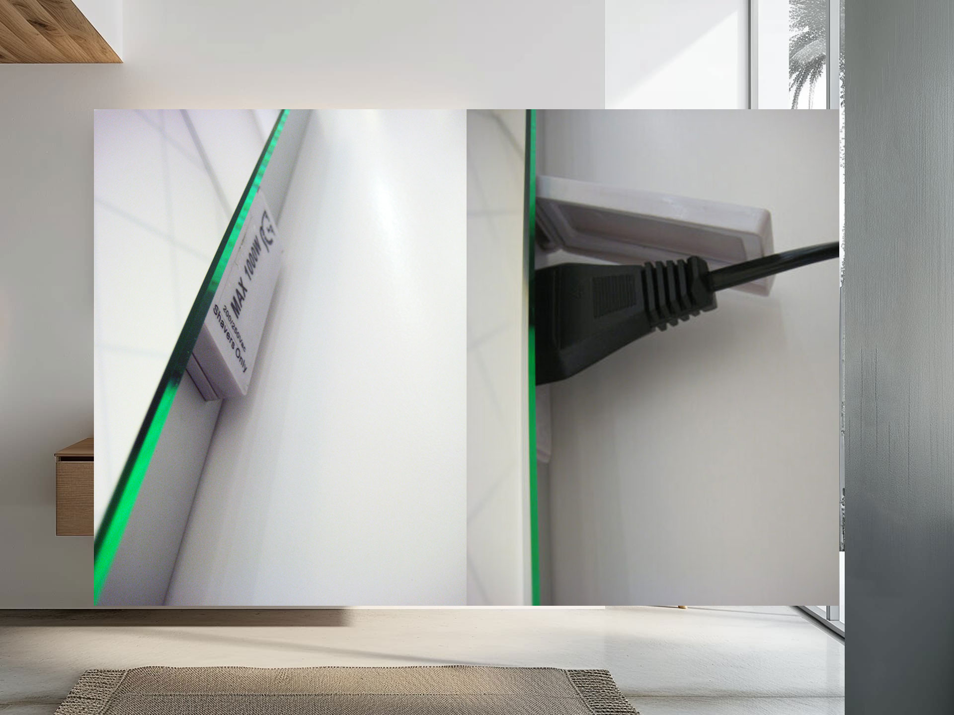 Für eine einfache Bedienung verfügt dieser Lichtspiegel über eine integrierte Spiegelheizung. Diese praktische Zusatzfunktion sorgt dafür, dass Ihr Spiegel nie wieder beschlägt! Da die Spiegelheizung nicht immer eingeschaltet sein muss, erfolgt die Bedienung über einen separaten Ein-/Ausschalter. Dieser Schalter wird 10 cm unterhalb des Sensorschalters platziert, siehe Foto.